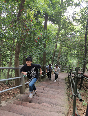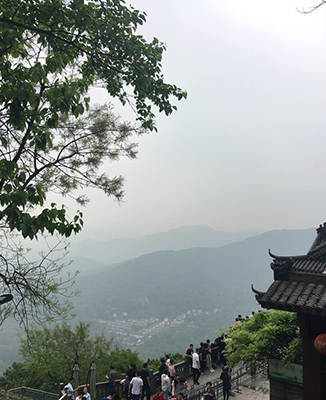 大约50分钟左右,我们一行到了山顶。居高赏景,群山屏障,连绵不断,树木茂盛,郁郁葱葱,还有美丽西湖尽在眼中,煞是好看。